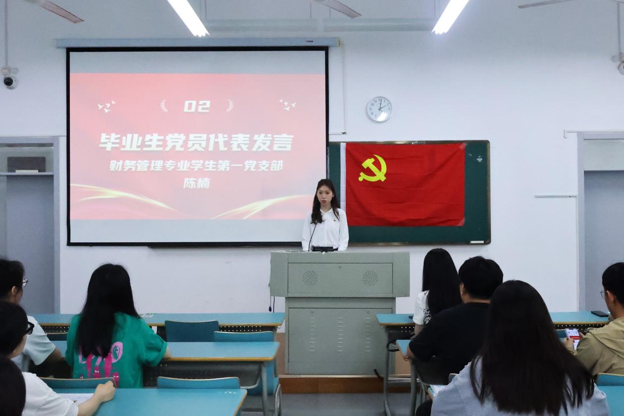 大会在庄严肃穆的国歌声中拉开帷幕。随后毕业生党员代表、浙江省优秀毕业生陈楠同志作了发言。陈楠同志深情回顾了四年来在党组织引领下的成长经历,分享了作为学生党员在理论学习、青年宣讲、社会实践、志愿服务中的点滴收获,号召全体毕业生党员筑牢信仰之基,做理论学习的“深耕者”、勇担时代重任,做实干兴邦的“践行者”、永葆为民初心,做人民至上的“守护者”,以实际行动践行新时代党员的使命与担当。