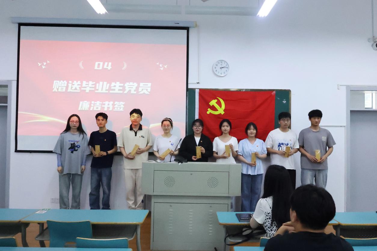 学院学工办副主任、旅游管理专业学生党支部书记陆银银为全体毕业生党员赠送了一份特别的礼物——廉洁书签。书签正面以“量尺”“莲花”为图案,寓意深刻,包括“心中有尺、行事有度”等廉洁警言,提醒毕业生党员要时刻绷紧廉洁自律这根弦,常怀敬畏之心,守住初心底线,扣好人生“第一粒扣子”。