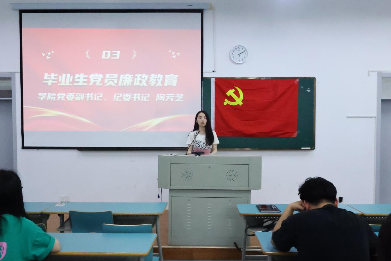 学院党委副书记、纪委书记陶芳芝以《清风作伴启新程 廉洁护航青春路》为题,向全体毕业生党员开展廉政教育。陶芳芝副书记紧扣青年党员成长发展实际,结合深入贯彻中央八项规定精神学习教育,深刻剖析了近年来典型违纪违法案例,以鲜活的反面教材警示大家要扣好廉洁自律的“第一粒扣子”。她勉励毕业生党员要坚定信仰、对党忠诚,要严守纪律、坚守底线,要担当实干、服务人民,自觉将清廉意识融入今后工作与生活之中,以清风正气护航青春征程,书写无悔人生。