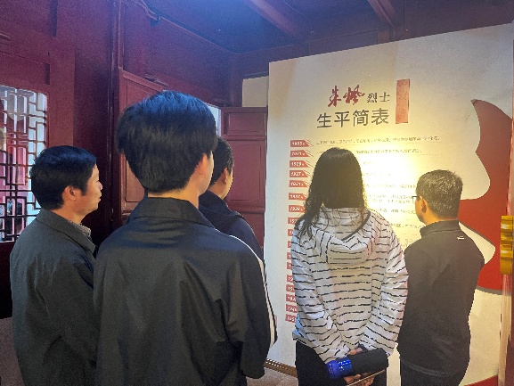 在镇海朱枫故居,教职工党员先后参观了“珠玉弥明 投身革命”“转辗迢遥 燃情激荡”“深入虎穴 传递情报”“从容就义 浩气长存”“魂归故土 流芳百世”等五个展区。泛黄的书信、珍贵的实物、亲友的题词,串联起朱枫烈士短暂却壮烈的一生。从满怀理想投身革命洪流,到辗转多地开展秘密工作,再到深入敌营传递关键情报,最后从容赴死坚守气节,每一幅画面都令人动容。